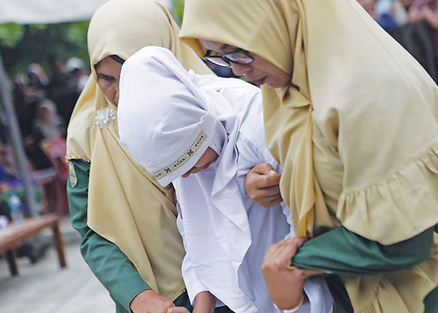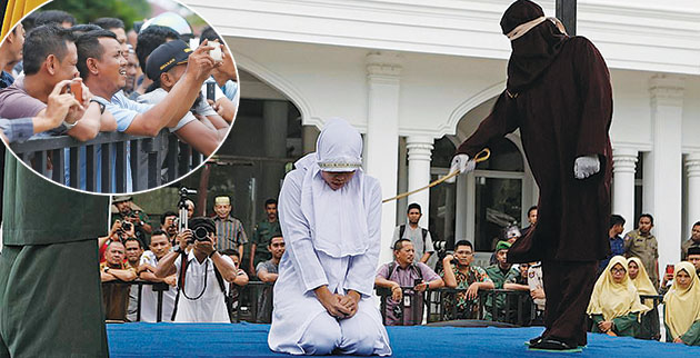 ❱❱ Πεσμένη στα γόνατα, με σκυμμένο κεφάλι και τρομοκρατημένη, γυναίκα υπέμενε το άγριο, δημόσιο μαστίγωμα που της επέβαλαν ως τιμωρία…… επειδή έκανε σεξ εκτός γάμου, οι Αρχές της επαρχίας Ατσε της Ινδονησίας, της μοναδικής που εφαρμόζει τον νόμο της σαρίας στη χώρα.