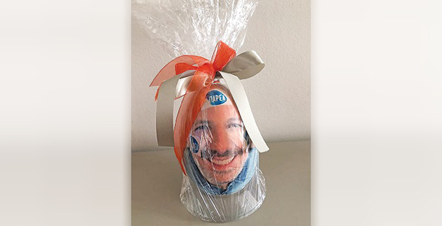 Ο ηθοποιός δεν πίστευε στα μάτια του και μετά το αρχικό σοκ ξέσπασε σε τρανταχτά γέλια. Οι συνεργάτες του ενθουσιασμένοι το φωτογράφησαν κι έπειτα δημοσίευσαν το γιορτινό «πεσκέσι» στο Instagram της εκπομπής συνοδεία ευχών για Καλό Πάσχα. Το εθιμοτυπικό για τις ημέρες σοκολατένιο αβγό φτιάχτηκε ειδικά για τον νικητή της φετινής σεζόν στην απογευματινή ζώνη του τηλεοπτικού σταθμού.