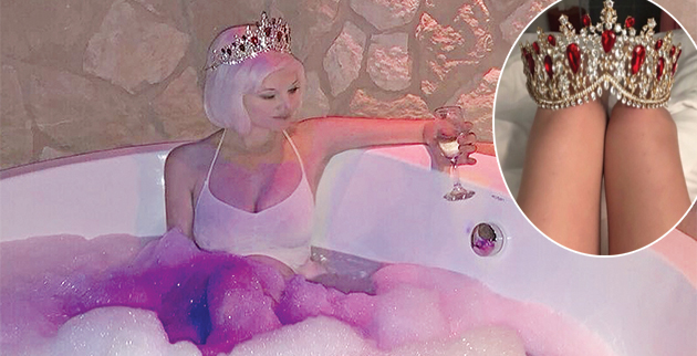 Η καλλονή σε τζακούζι. Ένθετη: Το μοντέλο στο κρεβάτι με το στέμμα στα πόδια του