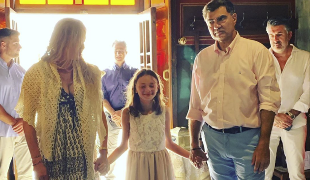 Ηταν το απόγευμα της Παρασκευής όταν η χαριτωμένη πιτσιρίκα, η οποία έχει κληρονομήσει από τη διάσημη μητέρα της το χάρισμα της επικοινωνίας, πέρασε την είσοδο εκκλησίας στην κοσμοπολίτικη Υδρα, όπου τελέστηκε το μυστήριο.