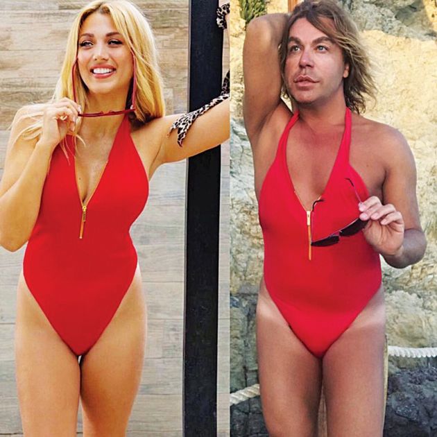 Συγκεκριμένα, ο Τρύφων τρόλαρε την Κωνσταντίνα Σπυροπούλου φορώντας ένα κόκκινο μαγιό από τη νέα σειρά που υπογράφει η ίδια ως «Queen Dina», ποζάροντας με παρόμοιο τρόπο με εκείνη.