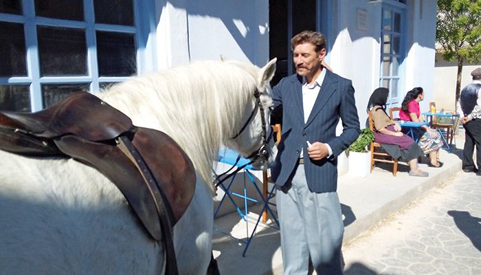 Κάπου παρακάτω η δεύτερη σκηνή είναι έτοιμη να γυριστεί. Σιωπή. Ο Μιλτιάδης (Γιώργος Γάλλος) παρακολουθεί τον γιο του Λάμπρο να μπαίνει κρυφά στο σχολείο με την Ελένη. Πλέον ξέρει ότι διατηρούν μυστικό δεσμό… Τελειώνει η σκηνή και οι ηθοποιοί μάς καλούν να πάρουμε ένα κρασάκι μαζί τους με φάβα, ταραμά, σαρδελίτσα. Γεύμα κάμπου… Κι εκεί που τους χαζεύουμε «κακούς» και «καλούς» να γελάνε μαζί, βλέπουμε τη σκληρή πεθερά Μυρσίνη (Κατερίνα Διδασκάλου) να φιλά τη νύφη της Ελένη (Μαρία Κίτσου) και να μας λέει ότι βρήκε σ’ αυτήν την παραγωγή την καλύτερη φίλη!