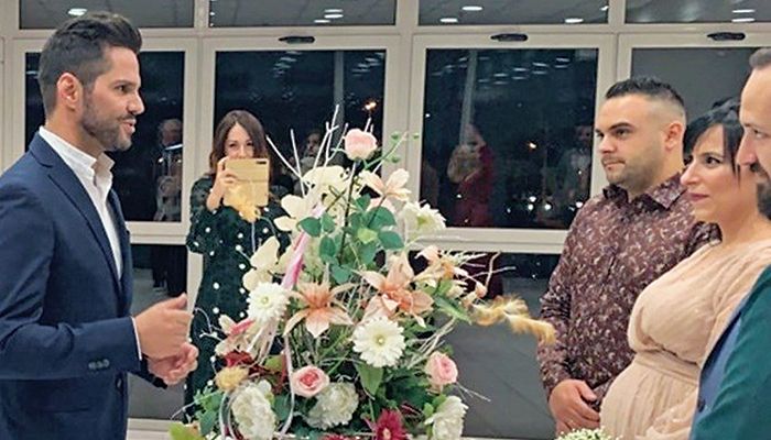 Ο γαμπρός και η νύφη, λίγο προτού υποδεχτούν το πρώτο παιδάκι τους, αποφάσισαν να ενωθούν με τα δεσμά του γάμου και πραγματικά δεν πίστευαν στα μάτια τους όταν είδαν τον Γιώργο Τσαλίκη μπροστά τους! Ο δημοφιλής αντιδήμαρχος, φορώντας σκουρόχρωμο κοστούμι, χωρίς γραβάτα, έδειχνε ενθουσιασμένος και συνάμα αγχωμένος.