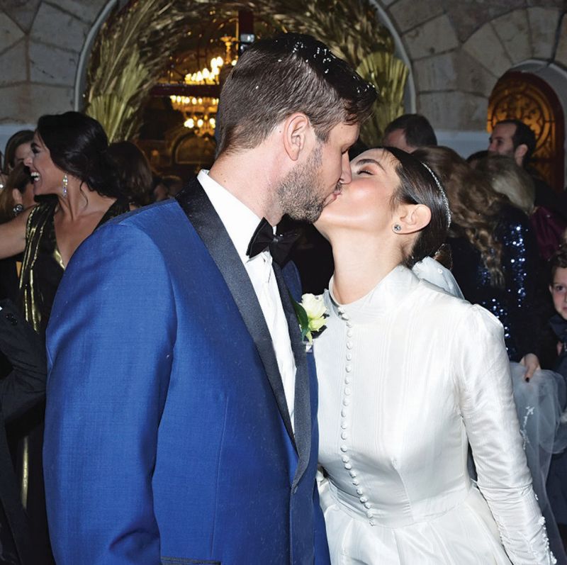 Η νύφη έλαμπε στο υπέροχο, αλά Γκρέις Κέλι νυφικό της, που σχεδίασε η Σήλια Κριθαριώτη, ενώ τα μαλλιά της χτένισε σε κότσο-σινιόν ο διάσημος κομμωτής από το Λονδίνο Michael Charalabous και τα στόλισε με μια διαμαντένια ριβιέρα, σε στιλ τιάρας. Στο αριστερό της χέρι έλαμπε το 20 καρατίων μονόπετρο, που ήταν δώρο του συζύγου της από τον οίκο Κάισαρη για τους αρραβώνες τους. Να σημειωθεί ότι το βράδυ της Παρασκευής είχε τελεστεί στον Ναό του Αγίου Διονυσίου, της Πανεπιστημίου, ο καθολικός γάμος τους, παρουσία μόνο συγγενών και κολλητών φίλων των νεονύμφων, όπως ο Στέφανος Οικονόμου, η Μαρίκα Καρούζου, ο Γιάννης Βογιατζής, και αμέσως μετά ακολούθησε πάρτι στο Athenee!