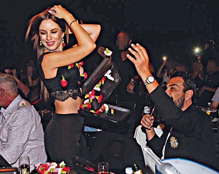 Κατά τη διάρκεια της παραμονής τους στο νυχτερινό κέντρο ο Ψηλός και η Ψηλού ήταν μέσα στα… μέλια, ανταλλάσσοντας αγκαλιές και φλογερά φιλιά στα χείλη. Μάλιστα, ο επιχειρηματίας αγόρασε δεκάδες πανέρια με γαρίφαλα, με τα οποία έρανε την εντυπωσιακή 22χρονη την ώρα που εκείνη λικνιζόταν αισθησιακά μπροστά του, χορεύοντας μόνο για τον ίδιο. Κάποια στιγμή ο επιχειρηματίας πήρε και το μικρόφωνο από τον Λευτέρη Πανταζή και τραγούδησε για τα πράσινα μάτια της όμορφης αγαπημένης του.