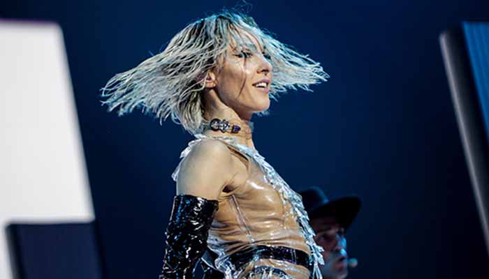 Η γνωστή για τις εξεζητημένες και ξεχωριστές ενδυματολογικές επιλογές της τραγουδίστρια φόρεσε λευκό, μίνι φόρεμα τουτού, λευκές ζαρτιέρες με κάλτσες, λευκά γάντια μέχρι το μπράτσο και λευκά λουστρίνι μποτάκια.