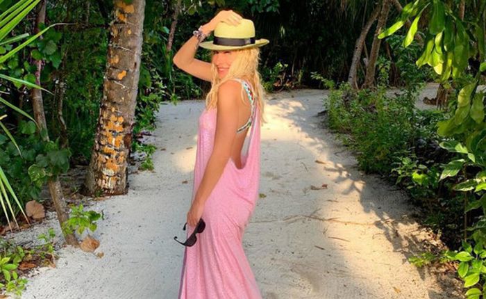 Η «ωραία Ελένη» μαυρισμένη από τις βουτιές στη θάλασσα πόζαρε κάτω από τον καυτό ήλιο με μακριά ροζ τουνίκ και από μέσα το μαγιό της, με σαγιονάρες και ψάθινο καπέλο.
