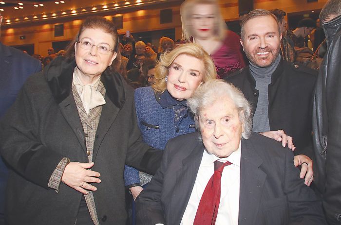 Ο κορυφαίος συνθέτης πλαισιωμένος από τη Λίνα Μενδώνη, τη Μαριάννα Βαρδινογιάννη και τον Γιώργο Βάλαρη