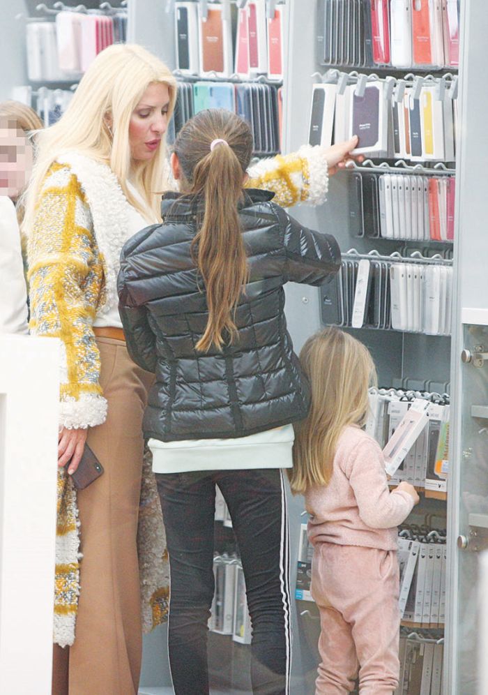 Η τρυφερή μαμά, κρατώντας από το χέρι τη μικρή Μαρίνα Παντζοπούλου κι έχοντας δίπλα της την όμορφη, ψηλόλιγνη Βαλέρια Λάτσιου, σεργιάνισε σε όλους τους ορόφους του πολυκαταστήματος, αναζητώντας από είδη ένδυσης μέχρι αξεσουάρ. Η πρώτη στάση τους ήταν σε μαγαζί κινητής τηλεφωνίας, όπου η Ελένη με την 11χρονη Λάουρα κοίταξε πολύχρωμες θήκες για κινητό τηλέφωνο.