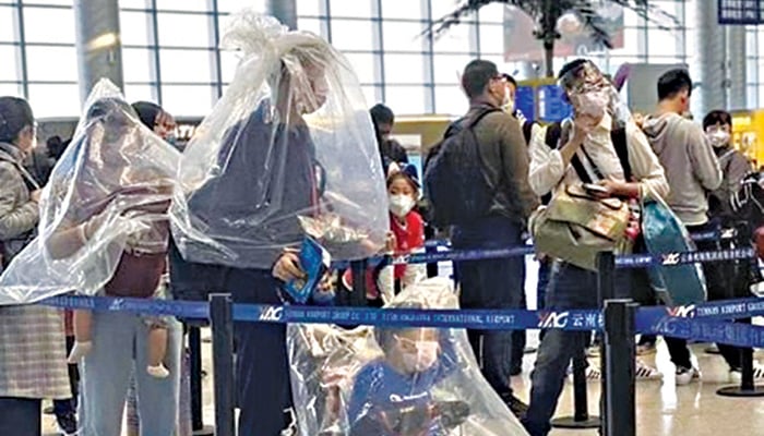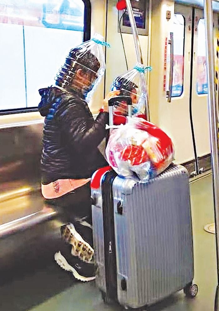 Με πλαστικές σακούλες, κράνη, ακόμα και άδειες μπουκάλες νερού στα κεφάλια τους, κυκλοφορούν στα αεροδρόμια και τα αεροπλάνα της Κίνας αγχωμένοι επιβάτες, στην προσπάθειά τους να προστατευτούν από τον κορονοϊό, τα κρούσματα του οποίου έχουν τριπλασιαστεί τις τρεις τελευταίες ημέρες.