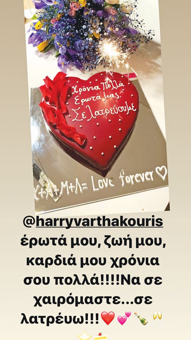 Στη συνέχεια δημοσίευσε ένα insta-story στον προσωπικό λογαριασμό της στο Instagram, γράφοντας ακόμα μία ευχή, μια ερωτική εξομολόγηση με φόντο τα δωράκια της προς τον νέο παρουσιαστή του «Big Brother», γιο του Γιάννη Πάριου: «Ερωτά μου, ζωή μου, καρδιά μου, χρόνια σου πολλά! Να σε χαιρόμαστε! Σε λατρεύω!». Οι δυο τους μπορεί να έδωσαν ρεσιτάλ καβγάδων στο «Globetrotters», ωστόσο ο έρωτάς τους καλά κρατεί από την πρώτη ημέρα που γνωρίστηκαν και συνεχίζεται καθ’ όλη τη διάρκεια των επτά χρόνων έγγαμης ευτυχισμένης ζωής!