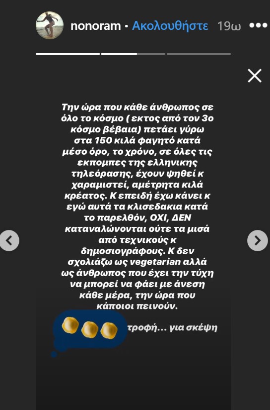 «Την ώρα που κάθε άνθρωπος σε όλο τον κόσμο (εκτός από τον 3ο κόσμο, βέβαια) πετάει γύρω στα 150 κιλά φαγητό κατά μέσο όρο, τον χρόνο, σε όλες τις εκπομπές της ελληνικής τηλεόρασης έχουν ψηθεί και χαραμιστεί αμέτρητα κιλά κρέατος. Κι επειδή έχω κάνει και εγώ αυτά τα κλισεδάκια κατά το παρελθόν, όχι, δεν καταναλώνονται ούτε τα μισά από τεχνικούς και δημοσιογράφους. Και δεν σχολιάζω ως vegetarian, αλλά ως άνθρωπος που έχει την τύχη να μπορεί να φάει με άνεση κάθε μέρα, την ώρα που κάποιοι πεινούν» ήταν το μήνυμα της παρουσιάστριας του Alpha.