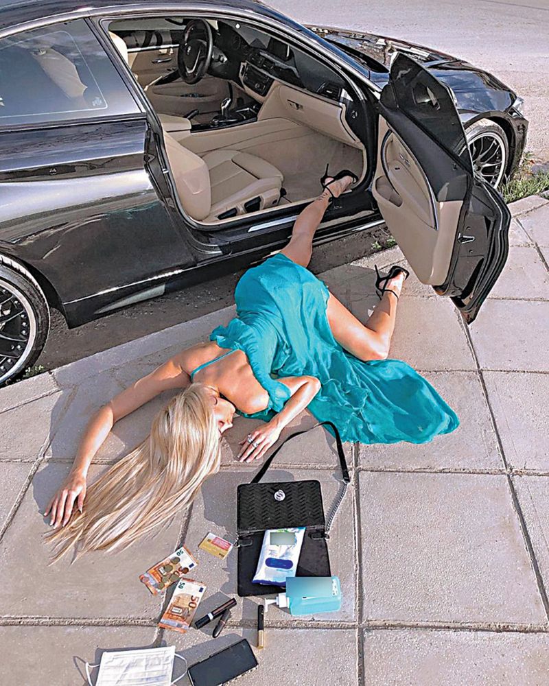 Η εκρηκτική ξανθιά πόζαρε ξαπλωμένη μπρούμυτα με αέρινο φόρεμα, πεσμένη έξω από πολυτελές αυτοκίνητο, με διάφορα προσωπικά της πράγματα σκορπισμένα από την ανοιχτή τσάντα της. Και δεν είναι αυτά που νομίζετε!