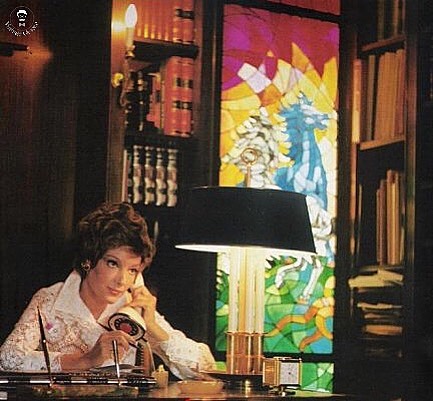 Υπό το φως του λαμπατέρ, μιλώντας στο περίτεχνο ακουστικό του τηλεφώνου της και κρατώντας μία πένα, η μεγάλη κυρία του κινηματογράφου, ντυμένη με λευκή δαντέλα και ανάμεσα σε βιβλία και έργα τέχνης, δεν κοιτάζει τον φωτογράφο. Έχει στυλώσει τα μεγάλα της μάτια ευθεία απέναντί της, δίνοντας την αίσθηση πως η εικόνα δεν είναι στημένη.