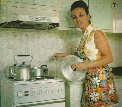 σε μία στιγμή δημιουργίας αλλά όχι μουσικής. Η σπουδαία φωνή του ελληνικού πενταγράμμου ποζάρει κι αυτή μαγειρεύοντας στην κουζίνα του σπιτιού της. Φοράει floral ποδιά και φόρεμα κι έχει τα μαλλιά της μαζεμένα σε έναν αυστηρά επιμελημένο κότσο. Κρατά στο ένα της χέρι το καπάκι της κατσαρόλας και στο άλλο την κουτάλα που ανακατεύει το φαγητό. Η εικόνα είναι έγχρωμη και τα χρώματα της δίνουν μία ζωντάνια, ανέγγιχτη θαρρείς από τον χρόνο.