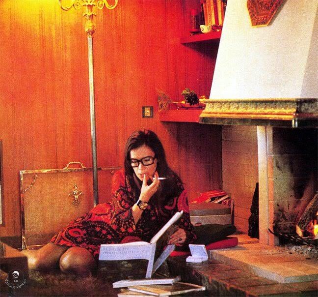 Μπροστά στο τζάκι με ένα τσιγάρο κι ένα βιβλίο… Η Τζένη Καρέζη ποζάρει στο σπίτι της να διαβάζει με τα στιλάτα μαύρα γυαλιά της και σοφιστικέ ύφος, ξαπλωμένη σχεδόν στο πάτωμα, μπροστά στο αναμμένο τζάκι, έχοντας φροντίσει κάθε λεπτομέρεια, ώστε η τελική εικόνα να είναι άρτια καλλιτεχνικά. Φοράει ένα φόρεμα στις αποχρώσεις του καφέ και του μπορντό, ενώ έχει φέρει το ένα της χέρι που κρατά τσιγάρο κοντά στο στόμα της για να δείξει πως την προβληματίζει αυτό που μελετά και δίπλα της διακρίνεται κι ένα σημειωματάριο.