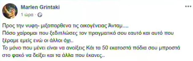 Συγκεκριμένα, επιτέθηκε στη Μαρία με απίστευτους χαρακτηρισμούς: «Προς τη νύφη μειξοπαρθένα της οικογένειας Aνταμ… Πόσο χαίρομαι που ξεδίπλωσες τον πραγματικό σου εαυτό και αυτό που ξέραμε εμείς, ενώ οι άλλοι όχι. Το μόνο που μένει είναι να ανοίξεις και τα 50 εκατοστά πόδια σου μπροστά στον φακό να δείξει και τα άλλα που έκανες» έγραψε χαρακτηριστικά.
