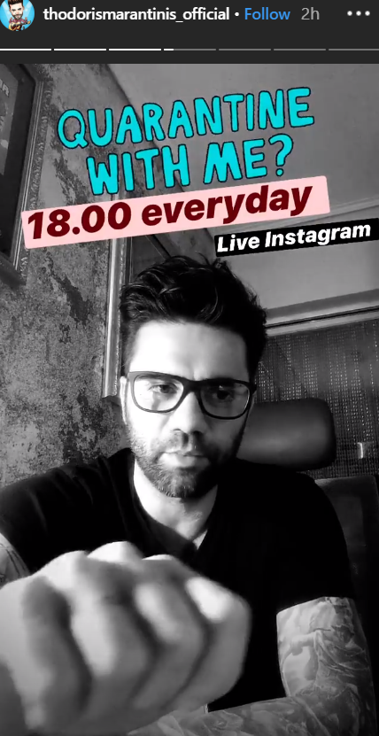 Τη δική του live εκπομπή μέσω Ιnstagram «έστησε» για τις ημέρες της απομόνωσης ο Θοδωρής Μαραντίνης, προσπαθώντας να ανεβάσει το ηθικό των followers του. Ο frontman των Onirama, όπως δήλωσε, βρήκε έτσι τον τρόπο να «σκοτώσει» την ανία του. Κάθε απόγευμα το ραντεβού των 6 με το κοινό του είναι σταθερό, ερμηνεύοντας δικές του επιτυχίες αλλά και σουξέ συναδέλφων του, ύστερα από παραγγελίες διαδικτυακών φίλων του. Παράλληλα, παρουσίασε το νέο του single με τίτλο «Αχ να σε ξέχναγα»!