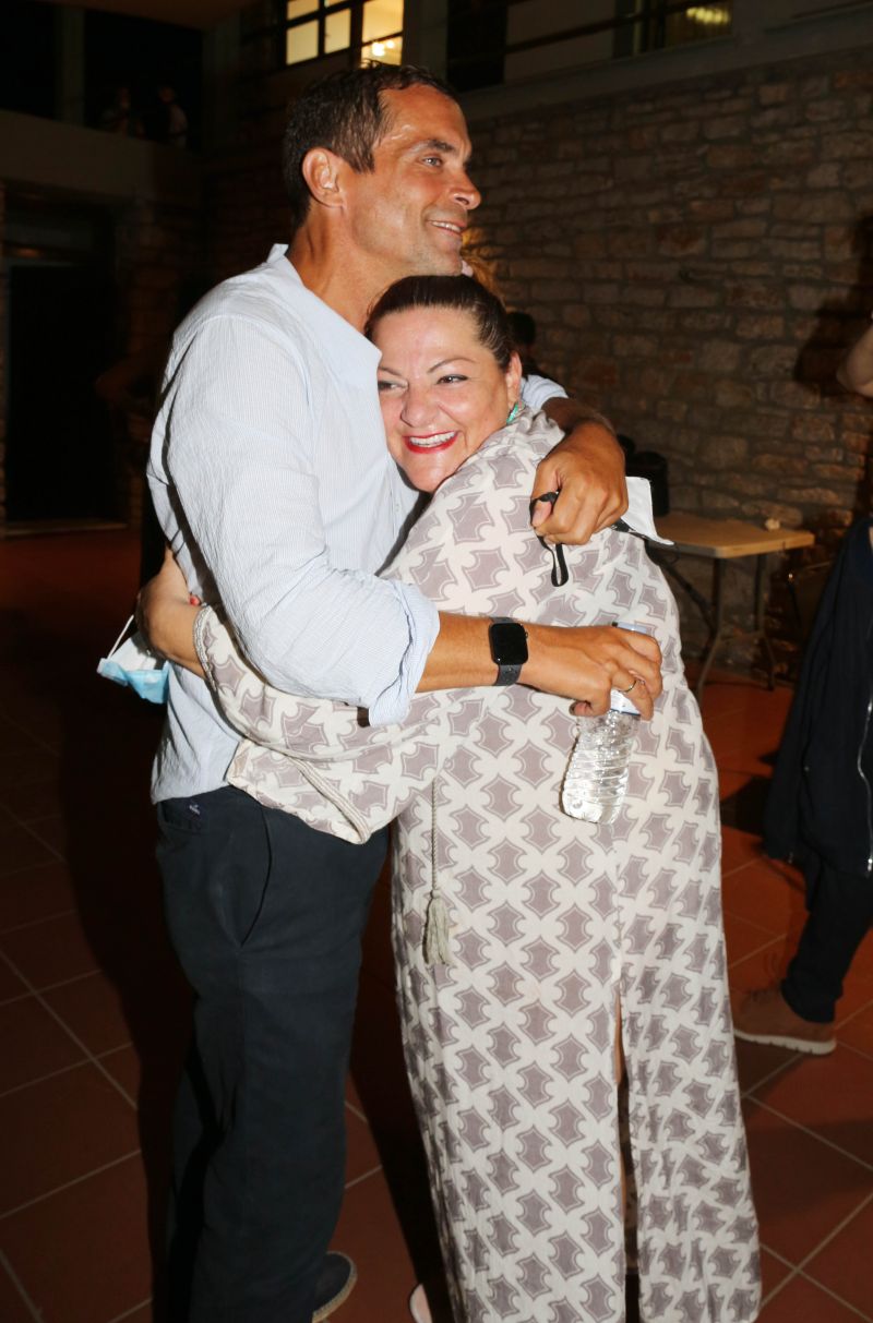 Εκεί ήταν επίσης η Μαρίζα Ρίζου, η οποία χειροκρότησε ενθουσιωδώς μαζί με το πλήθος τον σύντροφό της Οδυσσέα Παπασπηλιόπουλο, ο οποίος επιμελήθηκε τη σκηνοθεσία της παράστασης και κρατά έναν από τους βασικούς ρόλους. Το συγκεκριμένο ζευγάρι, ωστόσο, απέφυγε για ακόμη μία φορά τις κοινές φωτογραφίες. Απεναντίας, ο Νίκος Ψαρράς, ο οποίος επίσης παίζει στη «Λυσιστράτη», πόζαρε κατευθείαν στον φακό με τη γυναίκα του, Ελένη Καρακούλη, η οποία δεν γινόταν να λείπει από την πρεμιέρα του.