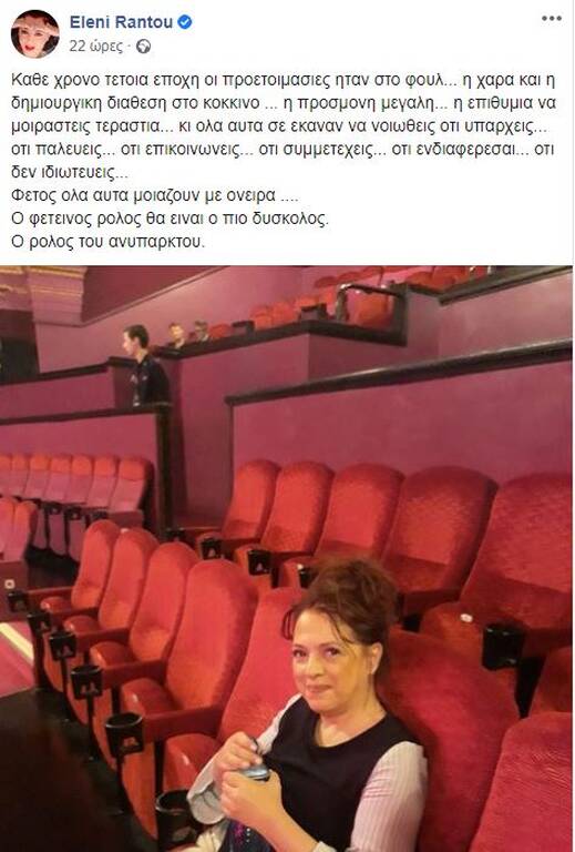 «Κάθε χρόνο τέτοια εποχή οι προετοιμασίες ήταν στο φουλ… Η χαρά και η δημιουργική διάθεση στο κόκκινο… Η προσμονή μεγάλη… Η επιθυμία να μοιραστείς τεράστια… Κι όλα αυτά σε έκαναν να νιώθεις ότι υπάρχεις… Ότι παλεύεις… Ότι επικοινωνείς… Ότι συμμετέχεις… Ότι ενδιαφέρεσαι… Ότι δεν ιδιωτεύεις…Φέτος όλα αυτά μοιάζουν με όνειρα… Ο φετινός ρόλος θα είναι ο πιο δύσκολος. Ο ρόλος του ανύπαρκτου» έγραψε χαρακτηριστικά.