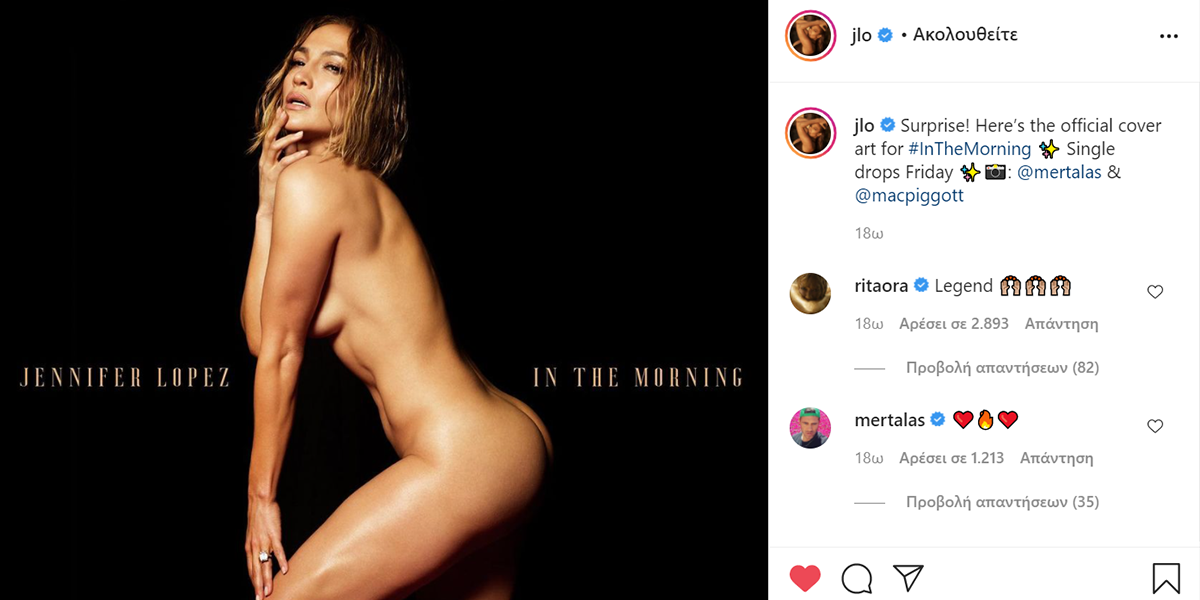 H 51χρονη Jennifer Lopez παρουσίασε το εξώφυλλο του νέου της single. Η σταρ φωτογραφήθηκε σε μαύρο φόντο εντελώς γυμνή με το εντυπωσιακό γραμμωμένο κορμί της να προκαλεί πανικό στους διαδικτυακούς της φίλους. Μέσα σε λίγα λεπτά το Instagram της, πήρε «φωτιά» από εκατομμύρια likes. H εκρηκτική τραγουδίστρια ενημέρωσε τους followers της πως το νέο της single «In the Morning» θα κυκλοφορήσει την Παρασκευή.