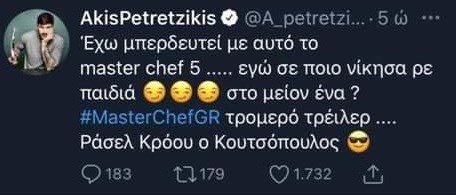 «Έχω μπερδευτεί με αυτό το MasterChef 5…. Εγώ σε ποιο νίκησα ρε παιδιά? Στο μείον ένα? Τρομερό τρέιλερ. Ράσελ Κρόου ο Κουτσόπουλος.», έγραψε χαρακτηριστικά ο Άκης Πετρετζίκης.