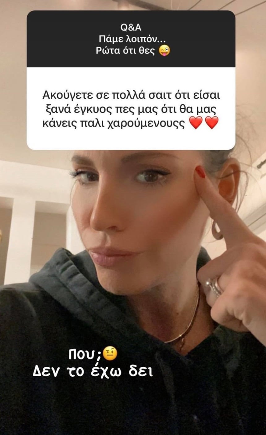 Η Αθηνά Οικονομάκου είναι λάτρεις των social media και καθημερινά μοιράζεται στιγμές με τους διαδικτυακούς της φίλους. Αυτή τη φορά η ηθοποιός επέλεξε να αφιερώσει χρόνο στους θαυμαστές της και να απαντήσει στα ερωτήματα τους. Ανάμεσα στις ερωτήσεις που δέχτηκε ήταν και κάποια που αφορούσαν την προσωπική της ζωή, καθώς ένας από τους ακόλουθους της, της έγραψε «ακούγεται σε πολλά sites ότι είναι ξανά έγκυος, πες μας ότι θα μας κάνεις πάλι χαρούμενους;». Η ίδια δεν θέλησε να δώσει κάποια ξεκάθαρη απάντηση και έτσι έγραψε χαρακτηριστικά «Πού; Δεν το έχω δει».