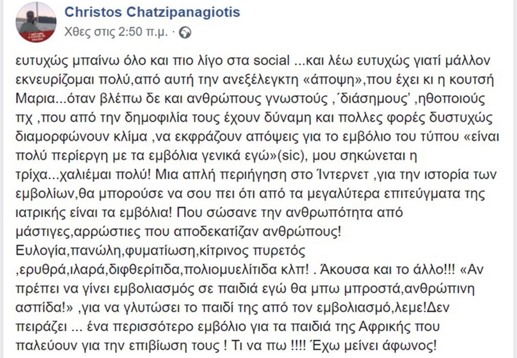 «Ευτυχώς μπαίνω όλο και πιο λίγο στα social… και λέω ευτυχώς γιατί μάλλον εκνευρίζομαι πολύ από αυτή την ανεξέλεγκτη “άποψη” που έχει κι η κουτσή Μαρία… όταν βλέπω δε και ανθρώπους γνωστούς , “διάσημους” ηθοποιούς πχ που από τη δημοφιλία τους έχουν δύναμη και πολλές φορές δυστυχώς διαμορφώνουν κλίμα, να εκφράζουν απόψεις για το εμβόλιο του τύπου “είναι πολύ περίεργη με τα εμβόλια γενικά εγώ”, μου σηκώνεται η τρίχα… χαλιέμαι πολύ! Μια απλή περιήγηση στο ίντερνετ για την ιστορία των εμβολίων, θα μπορούσε να σου πει ότι από τα μεγαλύτερα επιτεύγματα της ιατρικής είναι τα εμβόλια, που σώσανε την ανθρωπότητα από μάστιγες, αρρώστιες που αποδεκάτιζαν ανθρώπους: ευλογιά, πανώλη, φυματίωση, κίτρινος πυρετός, ερυθρά, ιλαρά, διφθερίτιδα, πολιομυελίτιδα κλπ. Άκουσα και το άλλο! “Αν πρέπει να γίνει εμβολιασμός σε παιδιά εγώ θα μπω μπροστά, ανθρώπινη ασπίδα” για να γλυτώσει το παιδί της από τον εμβολιασμό, λέμε! Δεν πειράζει … ένα περισσότερο εμβόλιο για τα παιδιά της Αφρικής που παλεύουν για την επιβίωση τους . Τι να πω; Έχω μείνει άφωνος!», έγραψε ο ηθοποιός.