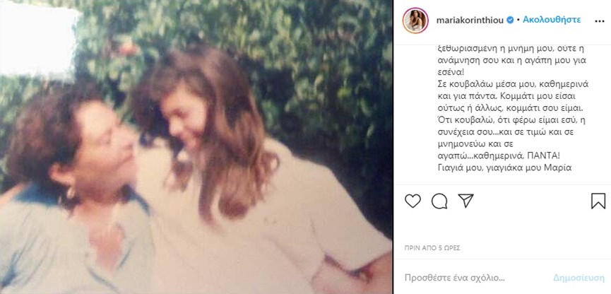 «Από αυτές τις παλιές, ξεθωριασμένες φωτογραφίες από το χρόνο… ξεχασμένες όμως όχι, ούτε ξεθωριασμένη η μνήμη μου, ούτε η ανάμνηση σου και η αγάπη μου για εσένα! Σε κουβαλάω μέσα μου, καθημερινά και για πάντα. Κομμάτι μου είσαι ούτως ή άλλως, κομμάτι σου είμαι. Ότι κουβαλώ, ότι φέρω είμαι εσύ, η συνέχεια σου…και σε τιμώ και σε μνημονεύω και σε αγαπώ… καθημερινά, ΠΑΝΤΑ! Γιαγιά μου, γιαγιάκα μου Μαρία», έγραψε η ηθοποίος.