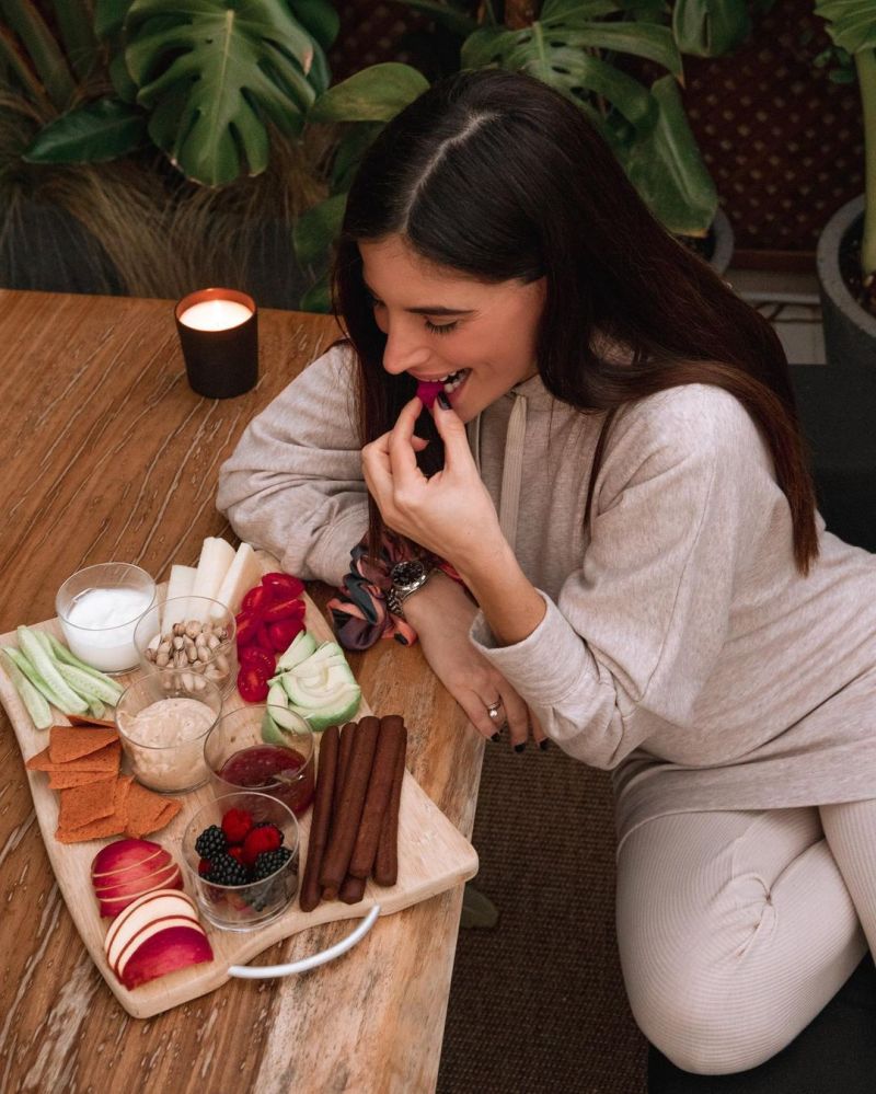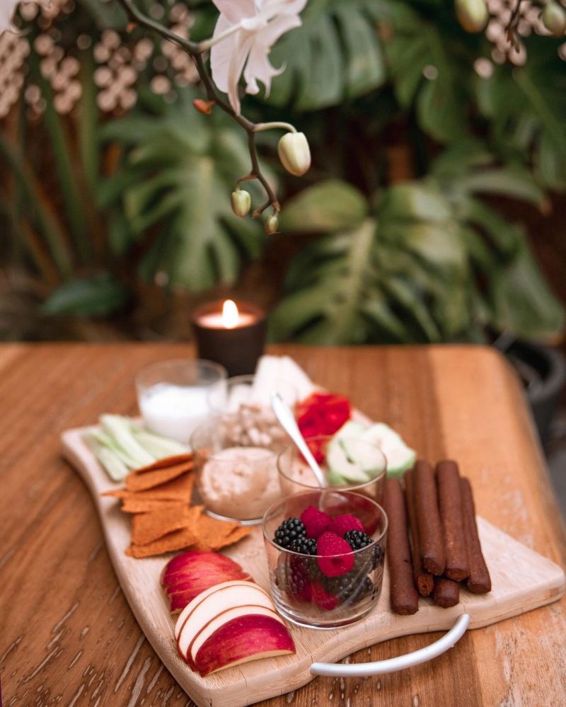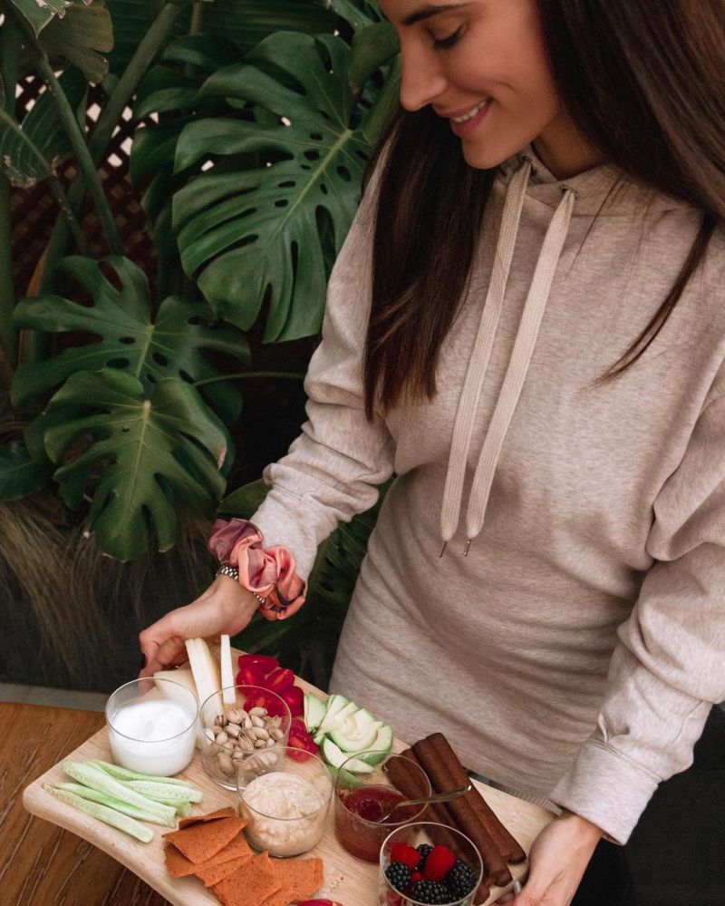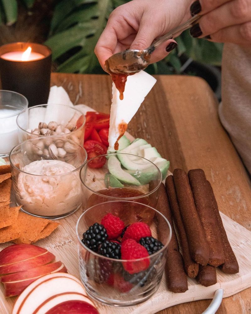 Ο δίσκος μου έχει τυρί, ντοματίνια, αβοκάντο, πρόβειο γιαούρτι, χούμους, μαρμελάδα φράουλα χωρίς ζάχαρη, μούρα, κριτσίνια χαρουπιού, φυστίκια αιγίνης, αγγουράκι, μήλο, κράκερ αμυγδάλου. Βιταμίνες, πρωτεΐνη, σύνθετοι υδατάνθρακες, προβιοτικά και πολλά θρεπτικά συστατικά σ’ενα δίσκο τσιμπολογήματος για όλη μέρα. Ωραία ιδέα;»
