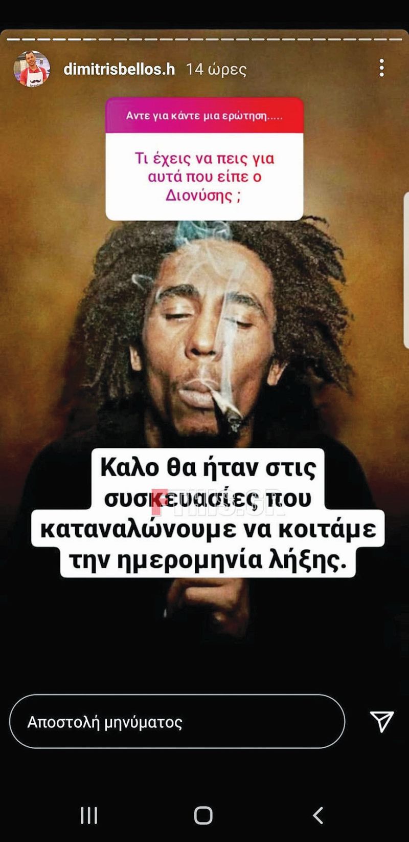 «Τι έχεις να πεις γι’ αυτά που είπε ο Διονύσης;» ρωτήθηκε ο Μπέλλος, ο οποίος πόσταρε μια φωτογραφία του Μπομπ Μάρλεϊ να καπνίζει ένα «πονηρό» τσιγάρο και σχολίασε με νόημα: «Καλό θα ήταν στις συσκευασίες που καταναλώνουμε να κοιτάμε την ημερομηνία λήξης».