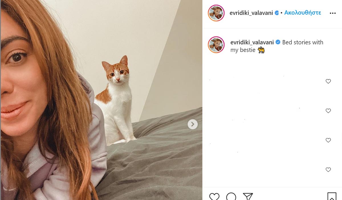 Η Ευρυδίκη Βαλαβάνη με ανάρτηση της στο Instagram θέλησε να μοιραστεί με τους διαδικτυακούς της φίλους, πως περνάει στο δωμάτιο του σπιτιού της, με την τετράποδη κολλητή της. Η παρουσιάστρια δημοσίευσε δυο φωτογραφίες της με το αγαπημένο της κατοικίδιο γράφοντας στη λεζάντα της:«Bed stories with my bestie».