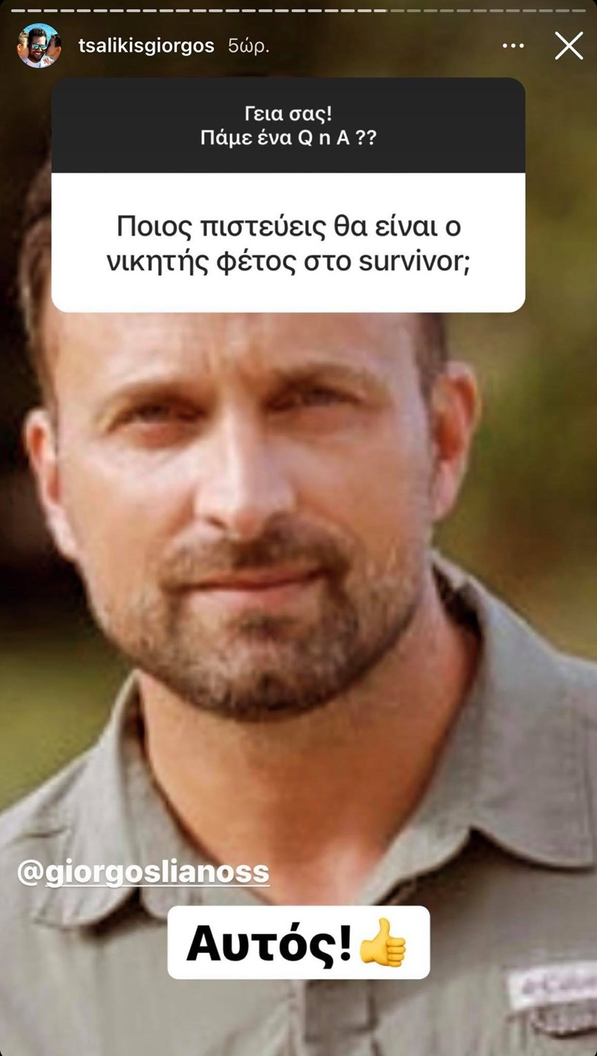 Ο Γιώργος Τσαλίκης καθημερινά μοιράζεται με τους διαδικτυακούς του φίλους στιγμιότυπα από την καθημερινότητα του. Ο γνωστός τραγουδιστής αυτή τη φορά ζήτησε από τους θαυμαστές του να του θέσουν τα ερωτήματα τους. Ένας από αυτούς μάλιστα, των ρώτησε ποιος πιστεύει ότι θα είναι ο νικητής του φετινού «Survivor». Ο Γιώργος Τσαλίκης σαν φανατικός τηλεθεατής του ριάλιτι επιβίωσης απάντησε με άκρως χιουμοριστικό τρόπο ότι ο νικητής θα είναι ο Γιώργος Λιανός.