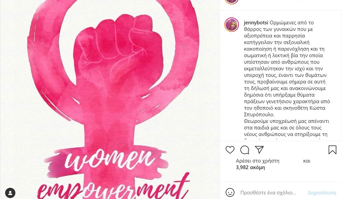 Μια νέα καταγγελία ήρθε στο φως της δημοσιότητας καθώς η Τζένη Μπότση, η Λουκία Μιχαλά και η Αγγελική Λάμπρη αποκάλυψαν το όνομα του ηθοποιού-σκηνοθέτη, που σύμφωνα με τα λεγόμενά τους, τις έχει παρενοχλήσει σεξουαλικά. Η ηθοποιός με ανάρτησή της στο Instagram ανέφερε χαρακτηριστικά ότι έπεσαν «θύματα πράξεων γενετήσιου χαρακτήρα από τον ηθοποιό και σκηνοθέτη Κώστα Σπυρόπουλο»