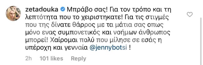 «Μπράβο σας! Για τον τρόπο και τη λεπτότητα που το χειριστήκατε. Για τις στιγμές που της δίνατε θάρρος με τα μάτια σας όπως μόνο ένας συμπονετικός και νοήμων άνθρωπος μπορεί! Χαίρομαι πολύ που μίλησε σε εσάς η υπέροχη γενναία @jennybotsi!», έγραψε η ηθοποιός.
