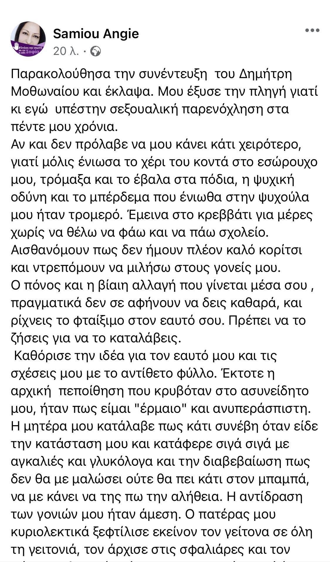 «Παρακολούθησα την συνέντευξη του Δημήτρη Μοθωναίου και έκλαψα. Μου έξυσε την πληγή γιατί κι εγώ υπέστην σεξουαλική παρενόχληση στα πέντε μου χρόνια. Αν και δεν πρόλαβε να μου κάνει κάτι χειρότερο, γιατί μόλις ένιωσα το χέρι του κοντά στο εσώρουχο μου, τρόμαξα και το έβαλα στα πόδια, η ψυχική οδύνη και το μπέρδεμα που ένιωθα στην ψυχούλα μου ήταν τρομερό. Έμεινα στο κρεββάτι για μέρες χωρίς να θέλω να φάω και να πάω σχολείο. Αισθανόμουν πως δεν ήμουν πλέον καλό κορίτσι και ντρεπόμουν να μιλήσω στους γονείς μου.