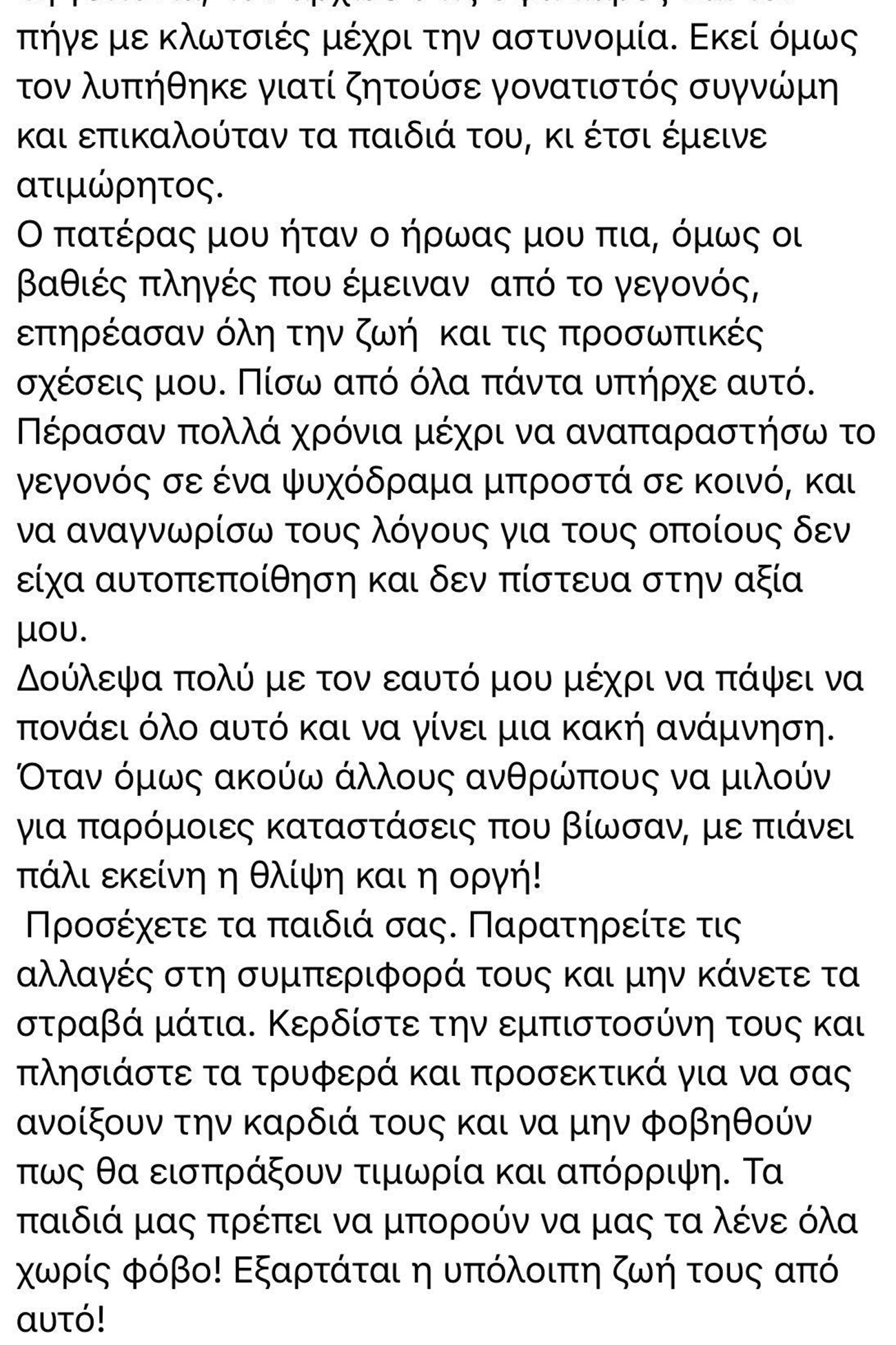 Η μητέρα μου κατάλαβε πως κάτι συνέβη όταν είδε την κατάσταση μου και κατάφερε σιγά σιγά με αγκαλιές και γλυκόλογα και την διαβεβαίωση πως δεν θα με μαλώσει ούτε θα πει κάτι στον μπαμπά, να με κάνει να της πω την αλήθεια. Η αντίδραση των γονιών μου ήταν άμεση. Ο πατέρας μου κυριολεκτικά ξεφτίλισε εκείνον τον γείτονα σε όλη τη γειτονιά, τον άρχισε στις σφαλιάρες και τον πήγε με κλωτσιές μέχρι την αστυνομία. Εκεί όμως τον λυπήθηκε γιατί ζητούσε γονατιστός συγνώμη και επικαλούταν τα παιδιά του, κι έτσι έμεινε ατιμώρητος.