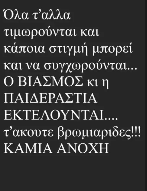«Όλα τα άλλα τιμωρούνται και κάποια στιγμή μπορεί και να συγχωρούνται. Ο ΒΙΑΣΜΟΣ και η ΠΑΙΔΕΡΑΣΤΙΑ εκτελούνται, τ΄ακούτε βρωμιάρηδες!!! ΚΑΜΙΑ ΑΝΟΧΗ» έγραψε χαρακτηριστικά.