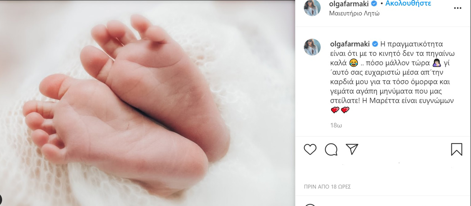 «Η πραγματικότητα είναι ότι με το κινητό δεν τα πηγαίνω καλά 😂 .. πόσο μάλλον τώρα 🤱🏻 γί´αυτό σας ευχαριστώ μέσα απ´την καρδιά μου για τα τόσο όμορφα και γεμάτα αγάπη μηνύματα που μας στείλατε! Η Μαρέττα είναι ευγνώμων 💕💕», έγραψε στη λεζάντα της η Όλγα Φαρμάκη.