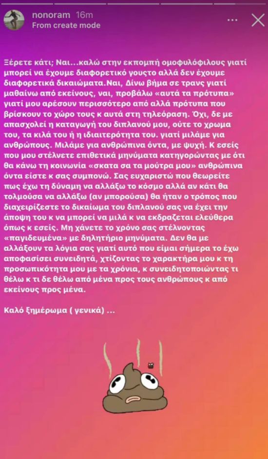 «Ξέρετε κάτι; Ναι, καλώ στην εκπομπή ομοφυλόφιλους γιατί μπορεί να έχουμε διαφορετικό γούστο αλλά δεν έχουμε διαφορετικά δικαιώματα. Ναι, δίνω βήμα σε τρανς γιατί μαθαίνω από εκείνους. Ναι, προβάλλω “αυτά τα πρότυπα” γιατί μου αρέσουν περισσότερο από άλλα προτυπα που βρίσκουν το χώρο τους κι αυτά στην τηλεόραση. Όχι, δε με απασχολεί η καταγωγή του διπλανού μου, ούτε το χρώμα του, ούτε τα κιλά του ή η ιδιαιτερότητα του, γιατί μιλάμε για ανθρώπους. Μιλάμε για ανθρώπινα όντα με ψυχή. Κι εσείς που μου στέλνετε επιθετικά μηνύματα κατηγορώντας με ότι θα κάνω την κοινωνία “σκατά σαν τα μούτρα μου”, ανθρώπινα όντα είστε και σας συμπονώ. Σας ευχαριστώ που θεωρείται πως εχω τη δύναμη να αλλάξω τον κόσμο αλλά αν κάτι θα τολμούσα να αλλάξω (αν μπορούσα) θα ήταν ο τρόπος που διαχειρίζεστε το δικαίωμα του διπλανου σας να έχει την άποψη του και να μπορεί να μιλά και να εκφράζεται ελευθερα όπως εσείς. Μη χάνεται το χρόνο σας στέλνοντας “παγιδευμένα” με δηλητήριο μηνύματα. Δε θα με αλλάξουν τα λόγια σας, γιατί αυτό που είμαι σήμερα το έχω αποφασίσει συνειδητά, χτίζοντας τον χαρακτήρα μου και την προσωπικότητα μου με τα χρόνια και συνειδητοποιόντας τι θέλω και τι δε θέλω από εμένα προς τους ανθρώπους και από εκείνους προς τα εμένα», έγραψε στη δημοσιευσή της η Ελεονώρα Μελέτη.