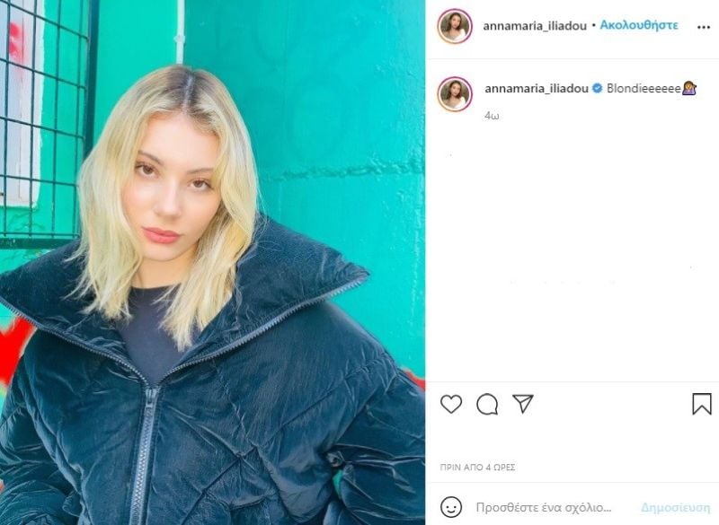 Η Άννα Μαρία Ηλιάδου είναι αρκετά ενεργή στα social media και φροντίζει να μοιράζεται στιγμές από την καθημερινότητά της με τους διαδικτυακούς της φίλους. Αυτή τη φορά το μοντέλο αποφάσισε να κάνει μία αλλαγή στην εικόνα της και συγκεκριμένα η Άννα Μαρία άλλαξε το χρώμα των μαλλιών της και από μελαχρινή, έγινε ξανθιά.