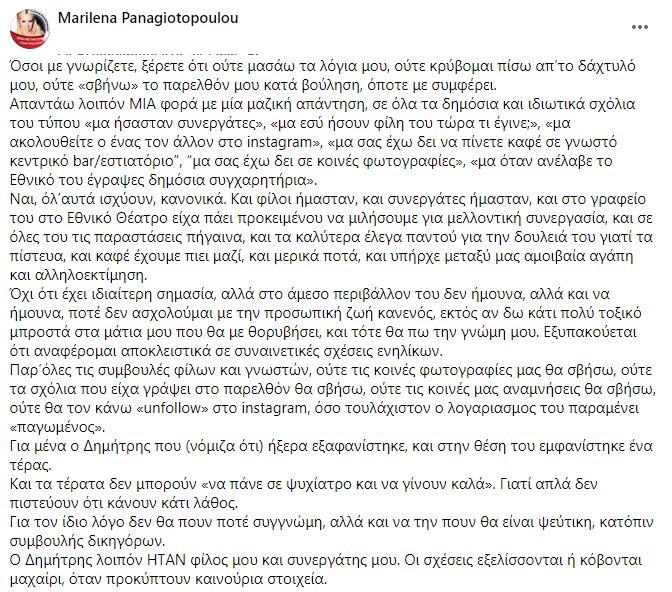 Ο Δημήτρης λοιπόν ΗΤΑΝ φίλος μου και συνεργάτης μου. Οι σχέσεις εξελίσσονται ή κόβονται μαχαίρι, όταν προκύπτουν καινούρια στοιχεία», έγραψε στην ανάρτηση της η Μαριλένα Παναγιωτοπούλου.