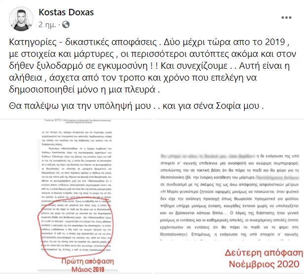 Όσον αφορά τις δικαστικές αποφάσεις που κοινοποίησε ο Κώστας Δόξας στον προσωπικό του λογαριασμό στο Facebook, η πρώην σύζυγος του ανέφερε ότι: «πρόκειται για απόσπασμα του δικόγραφου και συγκεκριμένα δικές του δηλώσεις και σε καμία περίπτωση απόφαση δικαστηρίου. Αφορά στη διατροφή και την επιμέλεια. Όχι στην αγωγή διαζυγίου, ούτε στη μήνυση για ενδοοικογενειακή βία. Η αγωγή διαζυγίου θα δικαστεί στις 19/11/21 και η μήνυση για ενδοοικογενειακή βία βρίσκεται στα χέρια του εισαγγελέα αυτήν τη στιγμή και αναμένουμε εξελίξεις. Γίνεται μια μεθόδευση αλλά ανεπιτυχής προσπάθεια αποπροσανατολισμού του ενδιαφέροντος από το βασικό ζήτημα. Αυτό του ξυλοδαρμού και της βίας. Δεν υπάρχει καμία αθωωτική απόφαση για τα περιστατικά βίας καθώς η συγκεκριμένη υπόθεση δεν έχει δικαστεί ακόμη», είπε χαρακτηριστικά στην εκπομπή.