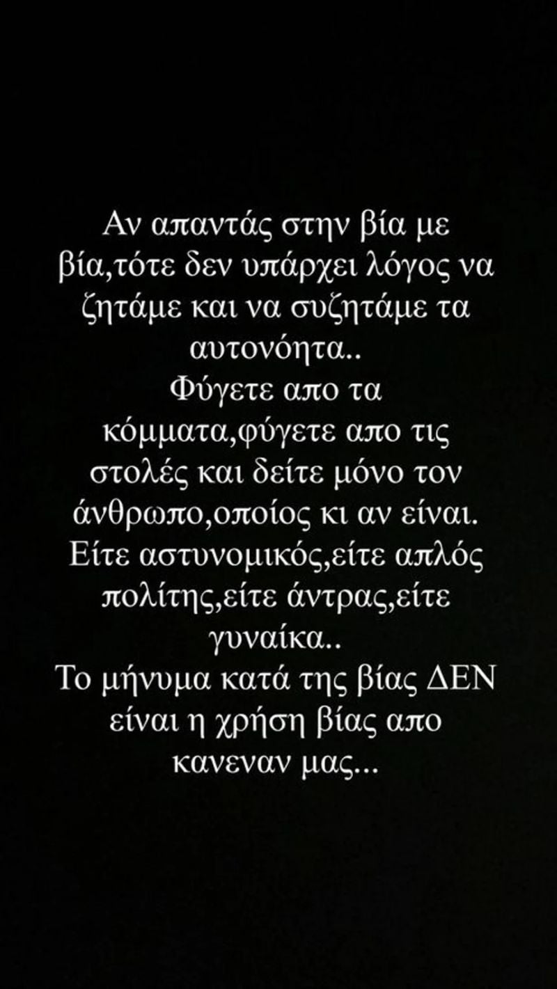 «Αν απαντάς στη βία με βία, τότε δεν υπάρχει λόγος να ζητάμε και να συζητάμε τα αυτονόητα. Φύγετε από τα κόμματα, φύγετε από τις στολές και δείτε μόνο τον άνθρωπο, όποιος κι αν είναι. Είτε αστυνομικός, είτε απλός πολίτης, είτε άντρας, είτε γυναίκα.