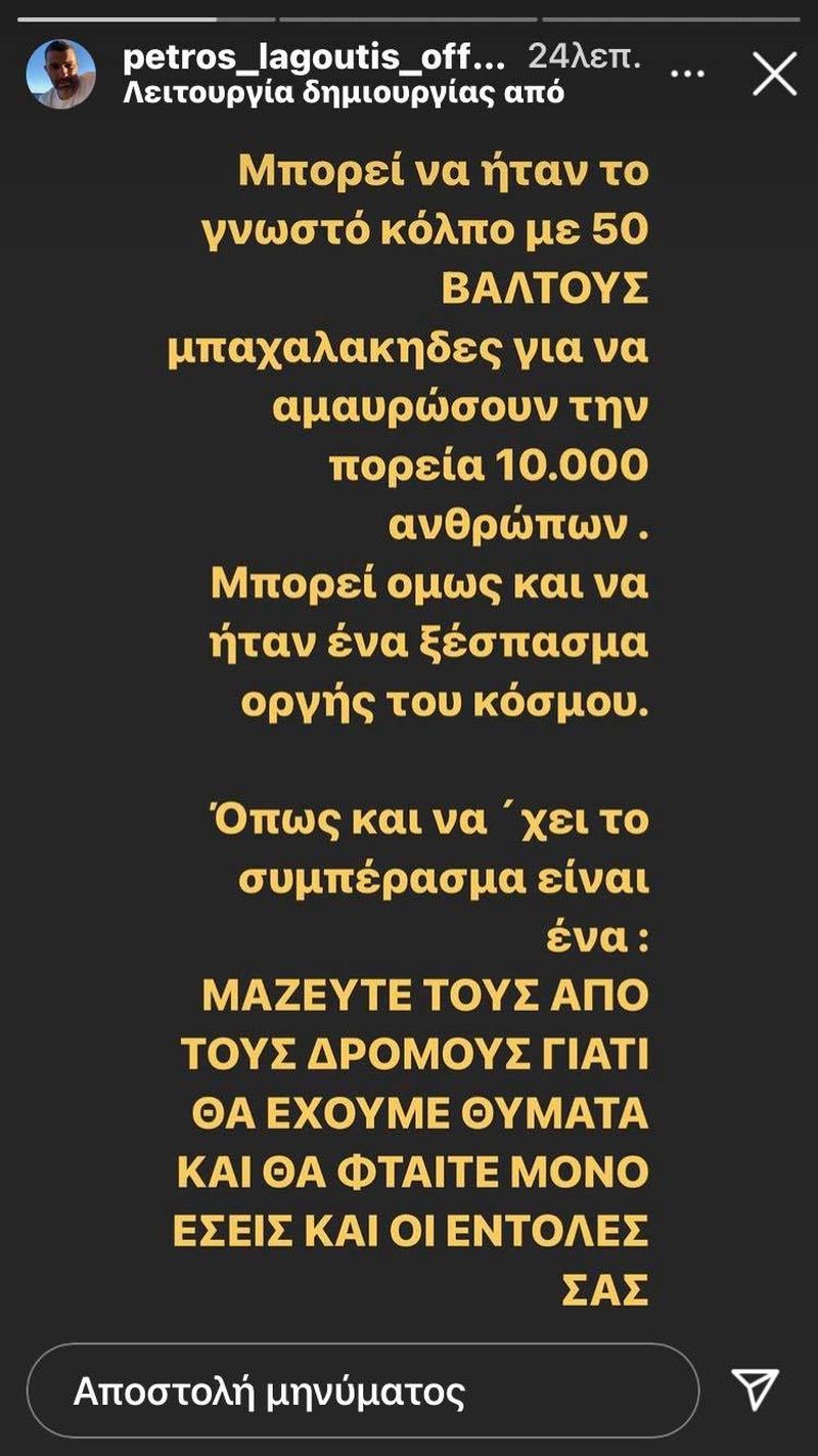 «Μπορεί να ήταν το γνωστό κόλπο με 50 βαλτούς μπαχαλάκηδες για να αμαυρώσουν την πορεία 10.000 ανθρώπων. Μπορεί όμως να ήταν και ένα ξέσπασμα οργής του κόσμου. Όπως και να ΄χει το συμπέρασμα είναι ένα: Μαζεύτε τους από τους δρόμους γιατί θα έχουμε θύματα και θα φταίτε μόνο εσείς και η εντολές σας» έγραψε και λίγο μετά συμπλήρωσε, «”Δυστυχώς κάποιοι αγνόησαν τις προειδοποιήσεις μας”… είπε ο Κυριάκος.. Διχαστικό… Απειλητικό… Τιμωρητικό… Κρίμα – Αίσχος»