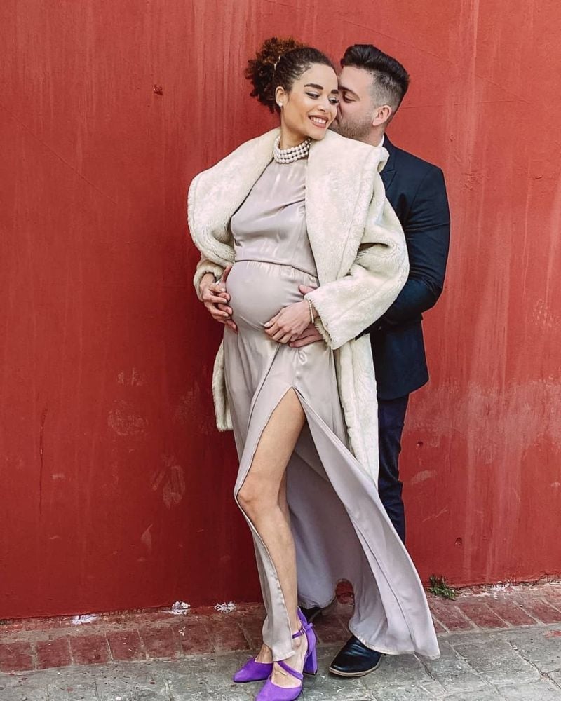 Οσο για τη νύφη, μπορεί να έχει φορέσει πολλά νυφικά λόγω δουλειάς, όμως στον πραγματικό της γάμο επέλεξε ένα σατέν φόρεμα στο χρώμα της άμμου, με σκίσιμο στο πόδι και μοβ γόβες, καθώς η τελετή έγινε στο δημαρχείο.