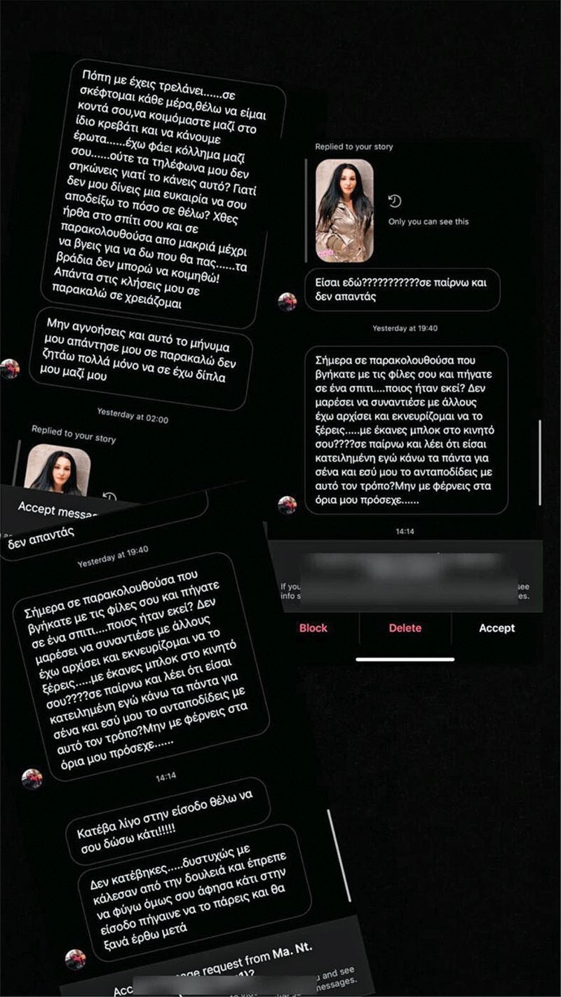 «Δεν συνηθίζω να δημοσιοποιώ στα social media μηνύματα που λαμβάνω, αυτή θα είναι η πρώτη και (ελπίζω) τελευταία φορά που θα μπω σε αυτή τη διαδικασία. Τις τελευταίες μέρες δέχομαι μηνύματα και κλήσεις από άγνωστο άνθρωπο, ο οποίος έχει αρχίσει και παραβιάζει την ιδιωτικότητά μου. Οπως φαίνεται γνωρίζει από άγνωστη πηγή τον αριθμό του κινητού μου, τον τόπο κατοικίας μου, καθώς και όλες τις κινήσεις μου (πού πάω, ποιους συναντώ, πού βρίσκομαι). Εχω αρχίσει να φοβάμαι ακόμα και μέσα στο ίδιο μου το σπίτι, κι έτσι αποφάσισα να προβώ σε κάθε νόμιμη διαδικασία για να τελειώσει όσο πιο σύντομα γίνεται αυτή η αρρωστημένη κατάσταση που ζω τις τελευταίες μέρες» έγραψε στον λογαριασμό της στο Instagram.