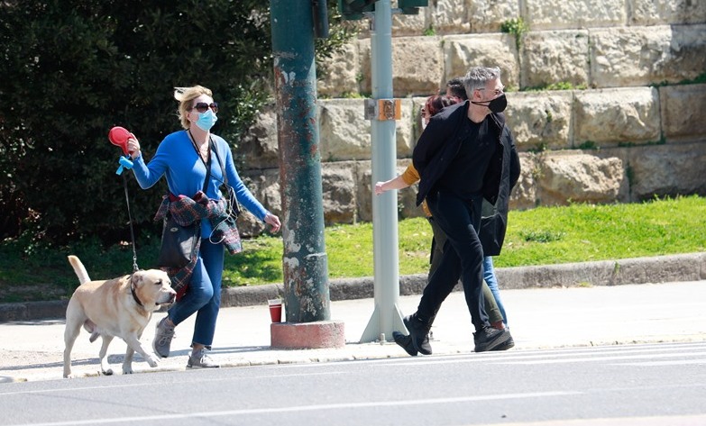 Η Σμαράγδα Καρύδη και ο Θοδωρής Αθερίδης τηρούν τα μέτρα προστασίας κατά του κορονοϊού και βγαίνουν βόλτα με τον σκύλο τους φορώντας μάσκες.