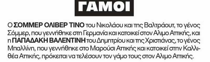 «Ο Σόμμερ Ολιβερ Τίνο του Νικολάου και της Βαλτράουτ, το γένος Σόμμερ, που γεννήθηκε στη Γερμανία και κατοικεί στον Αλιμο Αττικής, και η Παπαδάκη Βαλεντίνη του Δημητρίου και της Χριστιάνας, το γένος Μπαλλίνη, που γεννήθηκε στο Μαρούσι Αττικής και κατοικεί στην Καλλιθέα Αττικής, πρόκειται να τελέσουν τον γάμο τους στον Αλιμο Αττικής» αναφέρεται χαρακτηριστικά σε αυτήν.