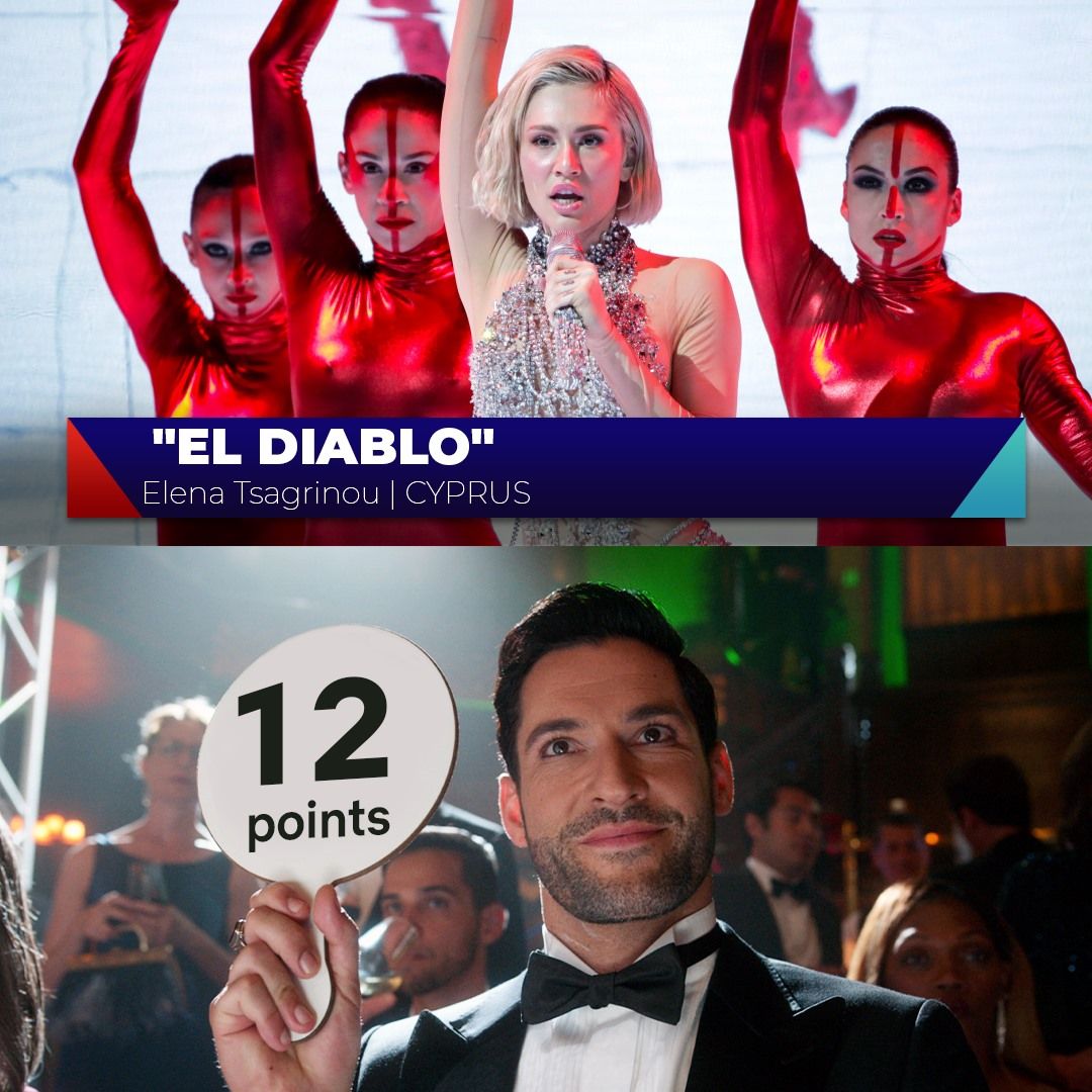 Πρόκειται για ένα κολάζ που δείχνει τον πρωταγωνιστή της σειράς «Lucifer» Τομ Eλις, ο οποίος ενσαρκώνει τον διάβολο, να δίνει 12άρι στην Eλενα Τσαγκρινού για το «El Diablo».